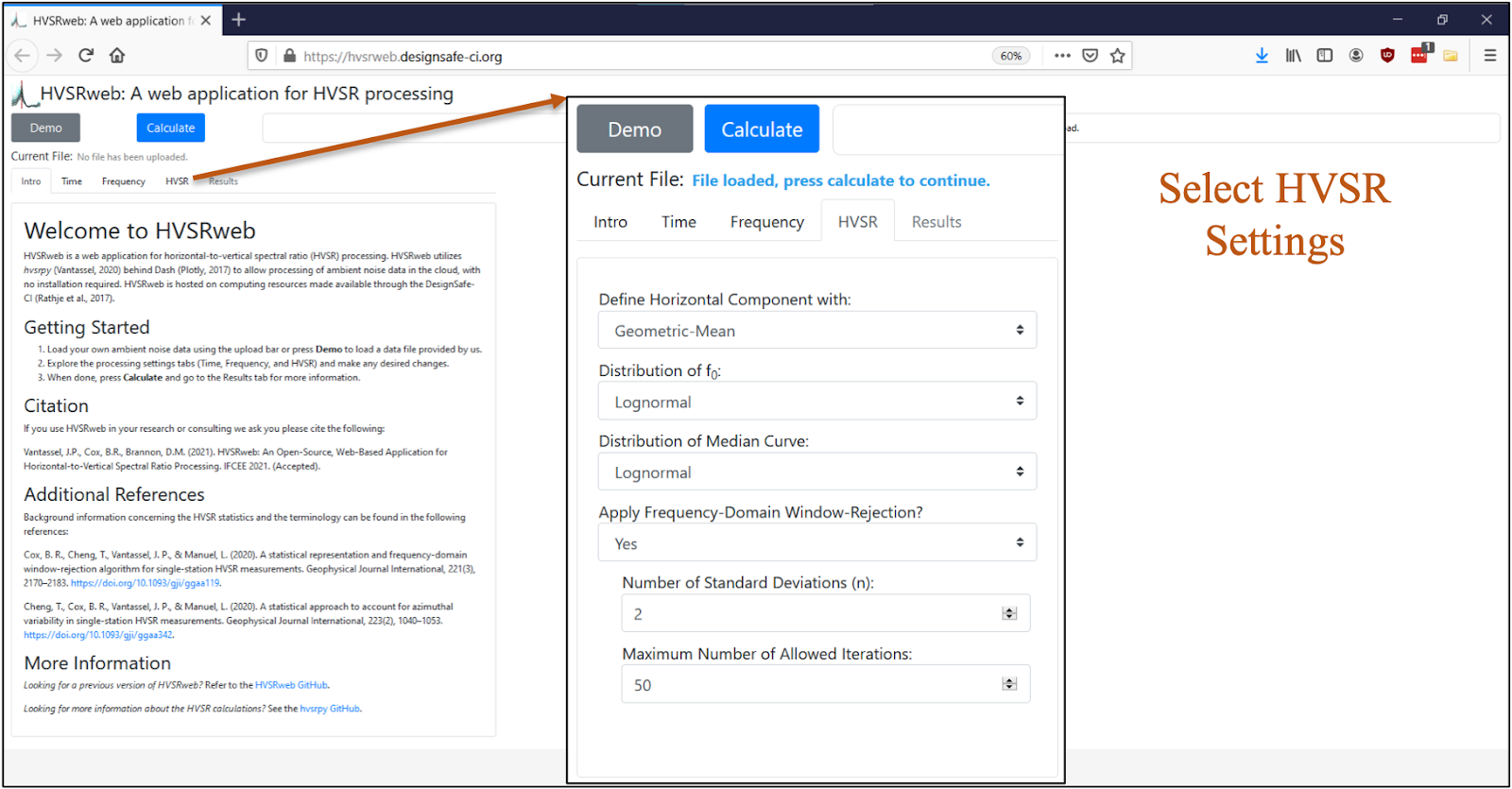 The horizontal-to-vertical spectral ratio (HVSR) method has become an increasingly popular tool for developing a quick and reliable estimate of a site’s fundamental natural frequency (f0). HVSRweb is an open-source, web-based application for performing HVSR calculations in a convenient, reliable, and statistically-consistent manner. HVSRweb allows the user to upload three-component ambient noise records and perform the HVSR calculation in the cloud, with no installation required. The HVSR calculation can be performed using a single combined horizontal component (e.g., geometric-mean, squared-average) or multiple rotated horizontal components to investigate azimuthal variability. HVSRweb can reject spurious time windows using an automated frequency-domain window-rejection algorithm, removing the need for subjective and time-consuming user interaction. It also facilitates the use of lognormal statistics for f0, allowing for a consistent statistical framework capable of quantifying measurement uncertainty in terms of either frequency or its reciprocal, period. In addition, HVSRweb presents the opportunity to rapidly incorporate new developments in processing and quantification of uncertainty as they emerge, and encourages standardization of HVSR processing across users while avoiding the challenges associated with traditional approaches that require the user to perform regular updates to keep pace with new developments.