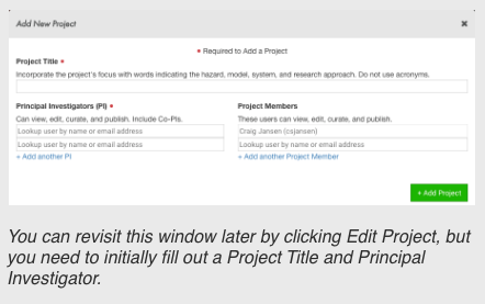 In the Add New Project window, fill in a project title and list the principal investigator (PI) and project members.