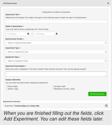 Adding an experiment involves filling out high level information about the files you will be publishing. Each experiment will receive its own DOI. Add multiple experiments if any of this information changes or you want multiple DOIs. Do not add another experiment if you are testing multiple models and this information stays the same. Instead, you can add multiple models to one experiment.