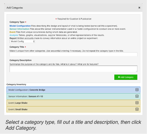 Categories group files together based on a shared purpose in an experiment. Be sure and read the definitions of each category to understand what files belong to each.