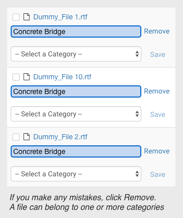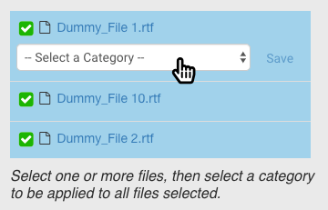 As you create categories, they will appear in a dropdown by each file. This allows you to group files in each category. Click Save to confirm the category.
