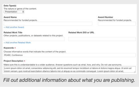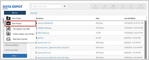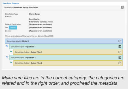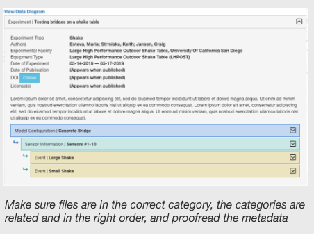 We offer step-by-step guides on how to create projects in the Data Depot, and curate and publish work/data across DesignSafe: Experimental, Simulation, Field Research, Research Software, Other, Versioning. For more information: Policies, Best Practices, Frequently Asked Questions.