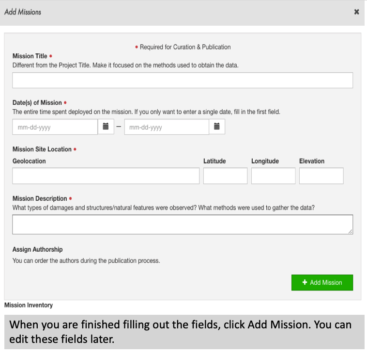 Each mission will receive a unique DOI. Add multiple missions if any of this high-level information changes or you want multiple DOIs. Do not add another mission if you are surveying the same location with different instruments and this information stays the same. Instead, you can add multiple collections to one mission.