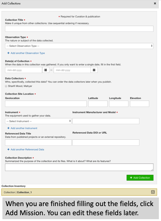 - When defining a collection, there are several information that are required to be filled for curation and publication purposes such as collection title, observation type, data of collection, data collector, collection site location, the instrument and a summarized description.