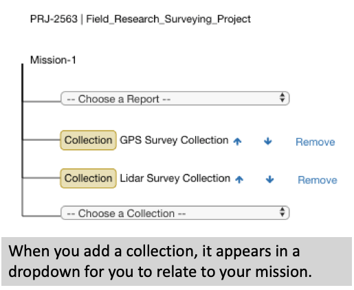 Relating Data allows you to relate collections to missions, which determines the organization of your dataset. You can also establish the order of your collections.
