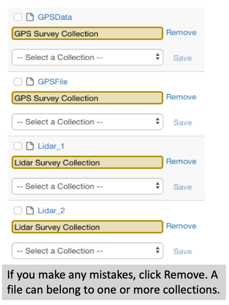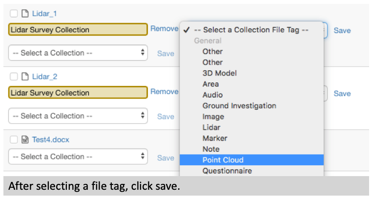 After putting files in collections, dropdowns will appear to allow you to tag/describe unique files.