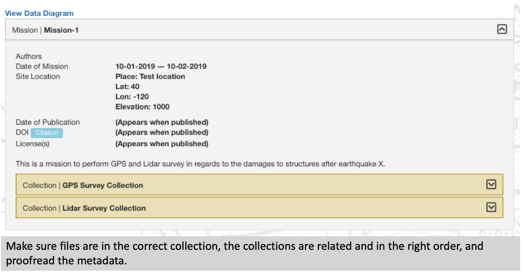 In Proofread Project, Missions, & Collections, take time to read all the descriptions and metadata you have entered. You will not be able to make changes after publishing.