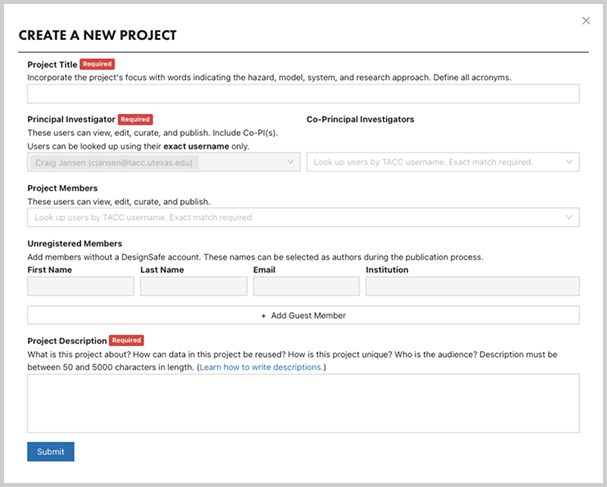 In the pop-up, enter a project title, description, and list the principal investigator (PI) and project members.