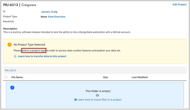 Fill out additional required fields in the Edit Project window, including a Data Type, then click Update Project and you will be brought to the Curation Directory.