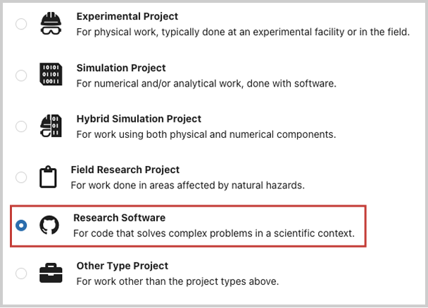 The research software option only publishes GitHub releases. If you don't use GitHub, select project type Other and make sure to select Research Software as the data type in the project metadata.
