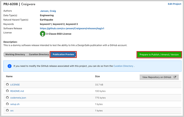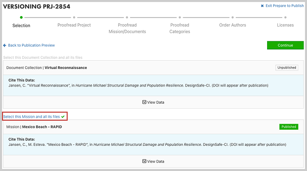 When you have proofread your metadata and verified that the correct files have been transfered, select Prepare to Publish/Version/Amend to continue.
