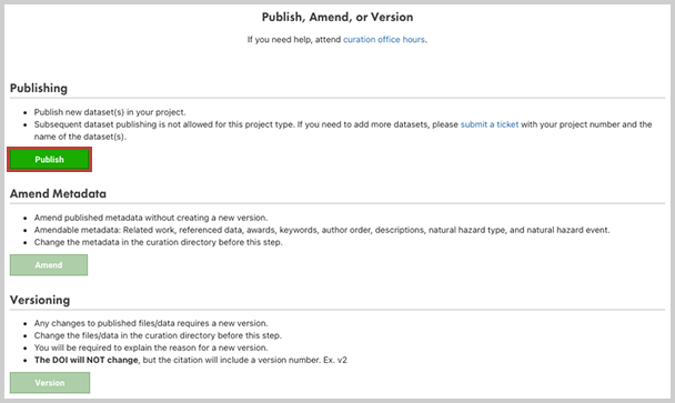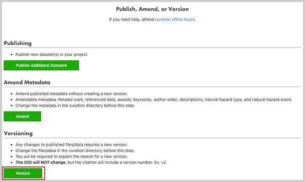 Select Prepare to Publish / Amend / Version in the Publication Preview and you will be given the choice to publish new datasets to your project, amend metadata, or version existing published datasets. Select Version to continue.