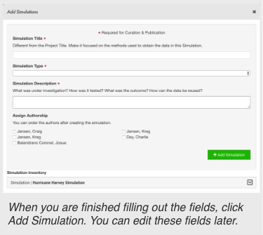 Adding a simulation involves filling out high level information about the files you will be publishing. Each simulation will receive its own DOI. Add multiple simulations if any of this information changes or you want multiple DOIs. Do not add another simulation if you are testing multiple models and this information stays the same. Instead, you can add multiple models to one simulation.