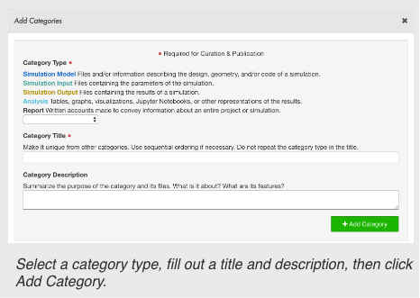 Categories group files together based on a shared purpose in a simulation. Be sure and read the definitions of each category to understand what files belong to each.