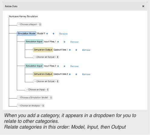Relating Data allows you to relate categories to each other and to an simulation, which determines the layout and order of categories in your publication. You can reorder the categories if needed.