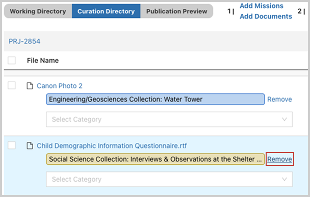 Remove files from a dataset in the Curation Directory by removing their relationship to the category/collection within the dataset.