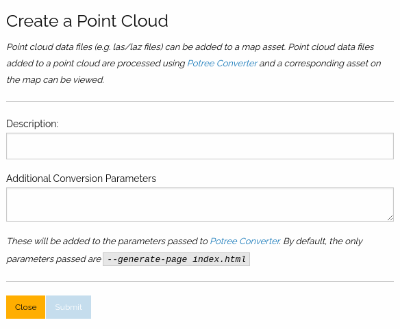 In the point cloud creation prompt, the user is required to create a Description for the point cloud object (This will be the name displayed in the assets panel as well). After that, by clicking on the Submit button, the user can create a point cloud object.