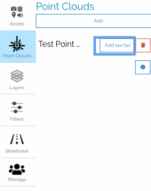 Now, the user can add a point cloud asset (las or laz), delete trash icon the point cloud object, or view info icon the object information.