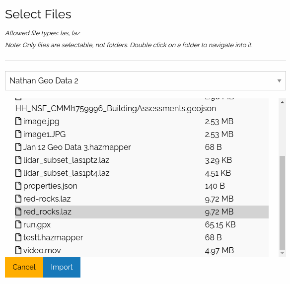 From the file browser, the user must select either a las or laz file and click Import.