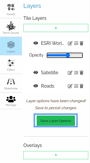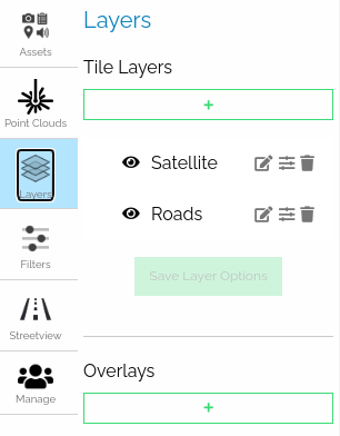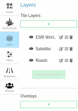 Using this panel users can select, create, edit, or delete tile layers. By default, the user will see the Satellite and Roads basemap layers.