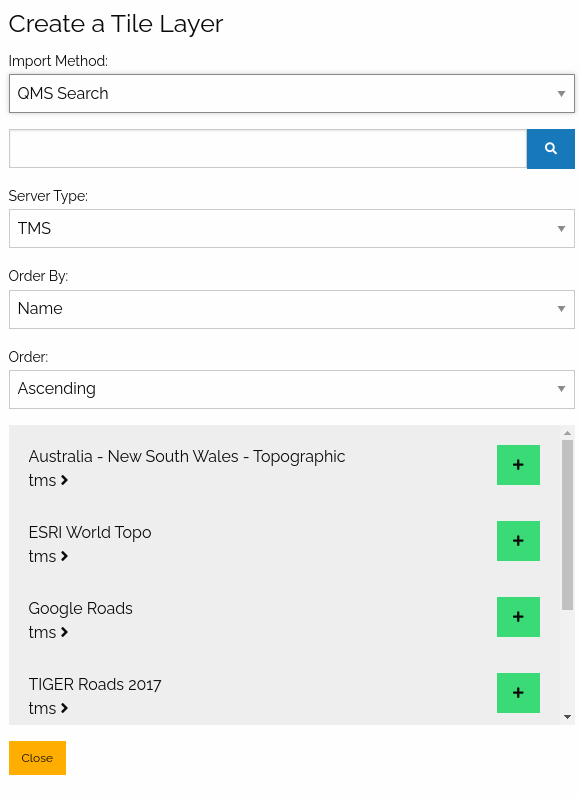 The QMS Search import method utilizes Quick Map Services to search for various tile layers and add them to the map.
