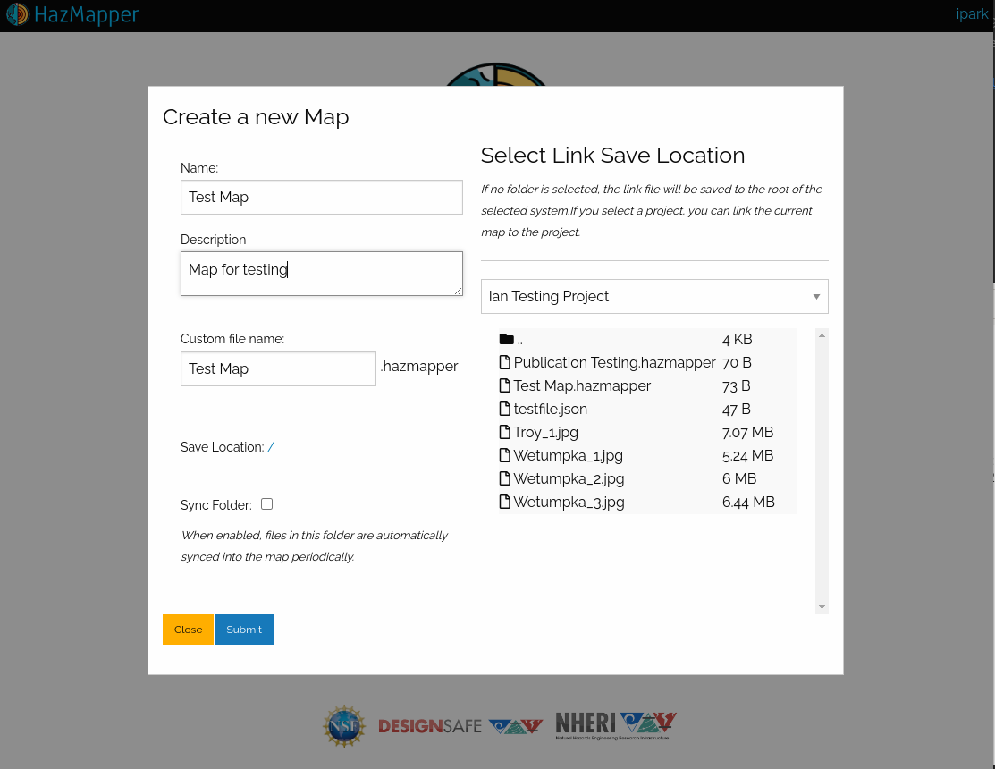 By saving the map into the correct DesignSafe project folder, Hazmapper automatically associates the map with that project. This ensures that once the project is published, the DesignSafe Published Project page can link directly to your Hazmapper map, providing a curated, interactive geospatial view of your data for the public.