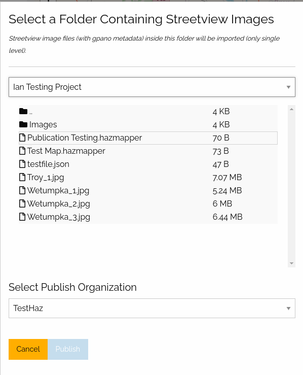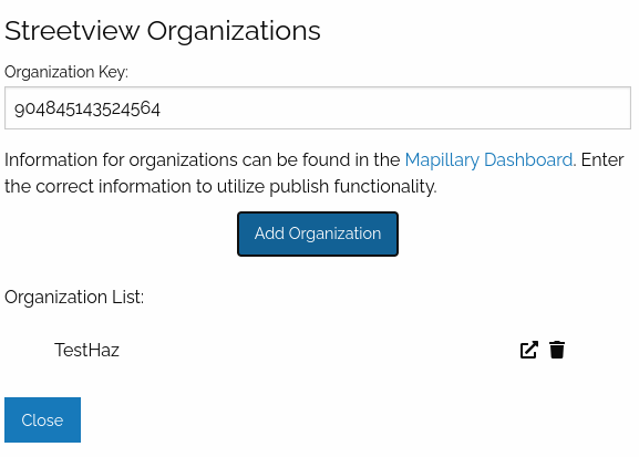 The Delete Streetview Service button will delete all of the associations created through publish or link. This operation cannot be reverted! So, the user must be extremely cautious before proceeding. This functionality was implemented so that if the user desires, the user could destroy all of the Mapillary information stored in Hazmapper.