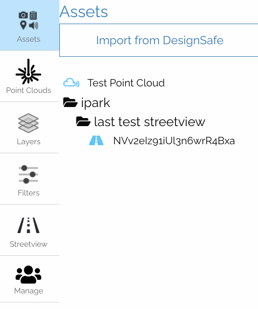 Note: Unless imported from the top-level (i.e. in the root of the folder), image, video, streetview assets will show up in the folders they are located in. On the other hand, point-cloud assets will always display at the root of the asset tree.