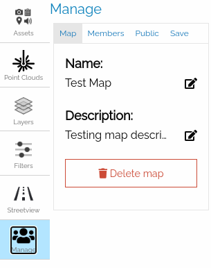 The Map tab allows the user to edit the name/description of the map and delete the map.