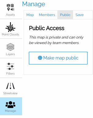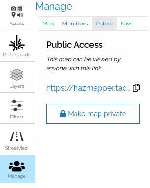 An owner of a map can create a "Public Map" by creating one in the Manage -> Public (tab) -> (icon) Make a public map. The user can open the map by clicking on the generated link. When clicking on the (icon) copy icon, the URL address of the public icon will be available.