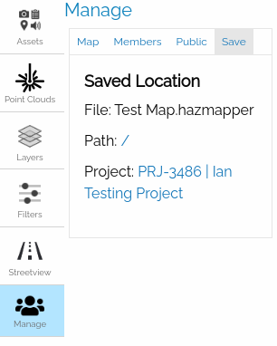 When creating a new map, the user is required to save the map to a location in DesignSafe. If saved in the Data Depot, the user creating the map will be the sole owner of the map with edit capabilities (import, delete, rename, etc). Otherwise, if saved to a DesignSafe project location, the users of the project will also have the right to edit the map.