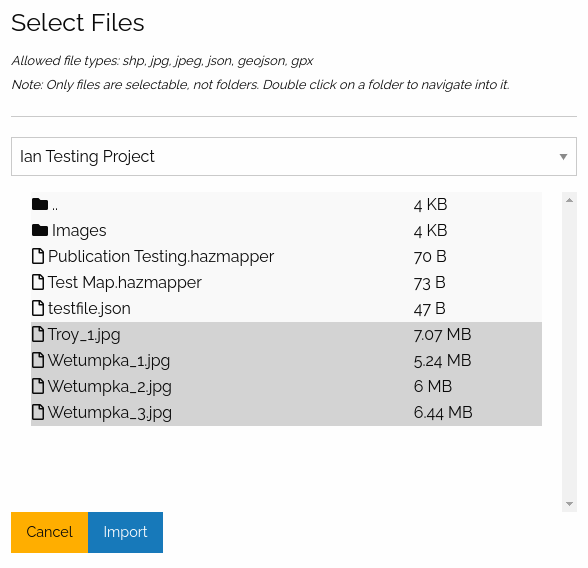 Currently, we support the following media assets. Note that these assets must have geospatial data (lat/lon) for Hazmapper to properly process and handle them. If the image is problematic, Hazmapper should show an error during the import process.