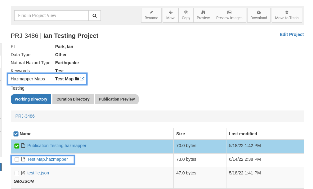 Once these steps are complete, your DesignSafe Published Project will automatically include a link to your Hazmapper map, giving other researchers and the public an interactive way to preview and discover your geospatial data.