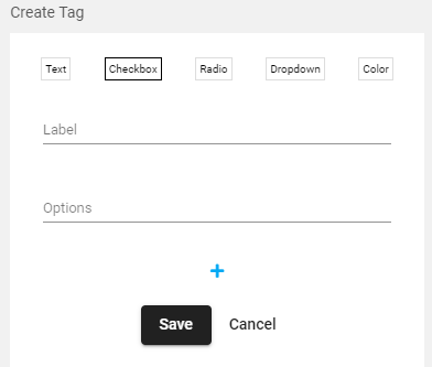 For this example, I am creating a Checkbox tag. The Tag itself has a Label and then you add as many Options are you wish by entering the name of each Option and then pressing the “+” button to add it to the list. In what is shown below, I added “CMU” as an Option, pressed the “+” to add it. Now I am adding Red brick as an Option, and am about to press the “+” to add it.
