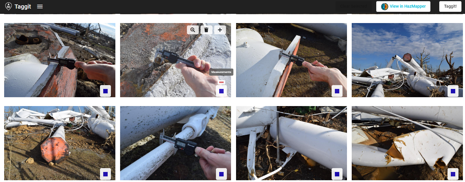 For this example, we will consider a case of a water tower that collapsed during the 10 December 2021 tornado in Mayfield, Kentucky. Numerous photos were taken of this collapsed debris of the water tower including photos of measurements of the structural components on the ground. Using Taggit, these photos were organized into a Group called “Measurements.” NOTE: These photos were grouped according to the instructions in the documentation file Grouping and Tagging Image Files. See that document if you do not know how to group and tag images with Taggit.
