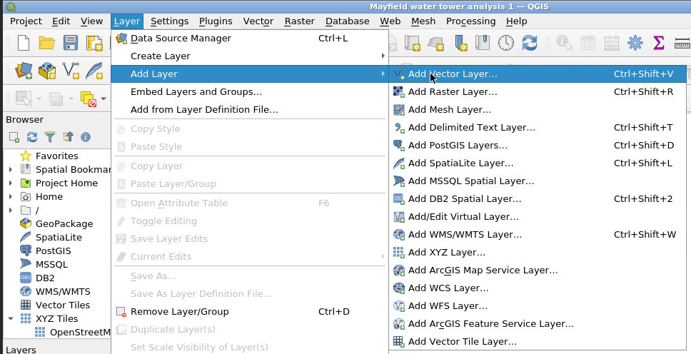 The shapefile data from the NWS DAT can then be loaded by selecting Layer, Add Layer, Add Vector Layer as shown below.
