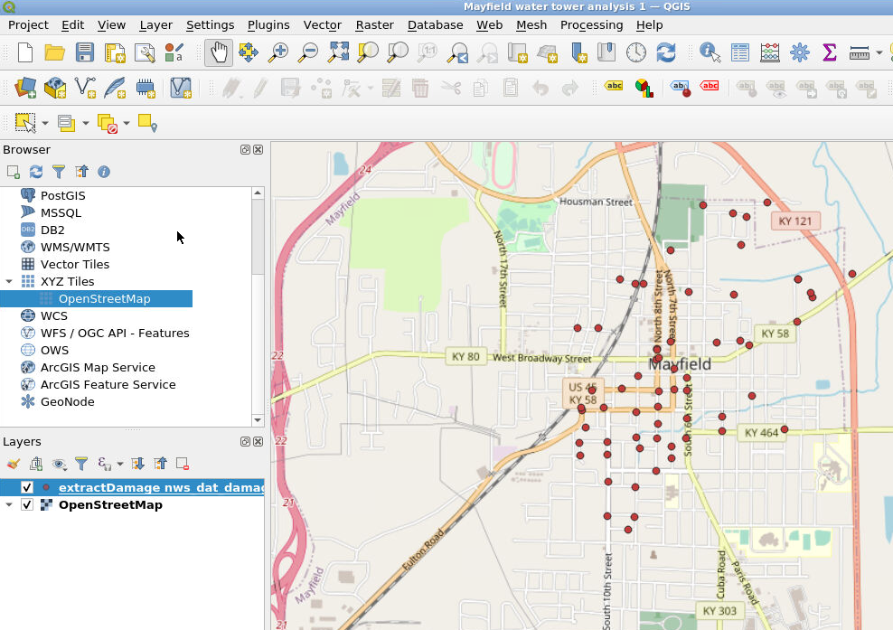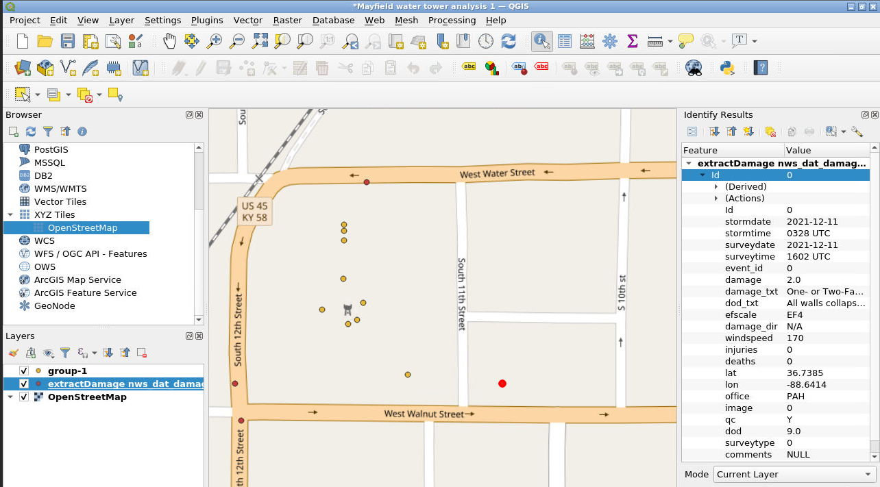 Zoom in on the portion of the map we’re interested in. For our example, we zoom in on Mayfield, Kentucky. Notice the “nws_dat” layer has been added to the Layers list.