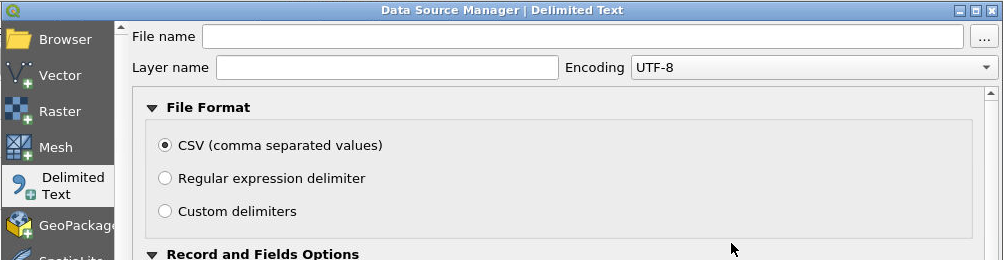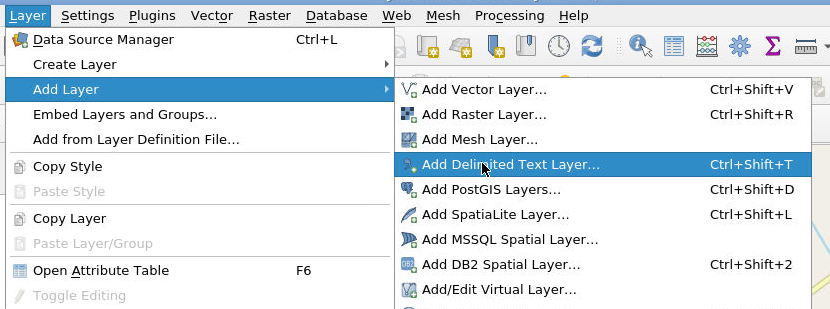 Now we will load the csv data that we generated with Taggit. Select the csv file that corresponds to the “Measurements” group mentioned earlier by selecting Layer, Add Layer, Add Delimited Text Layer.