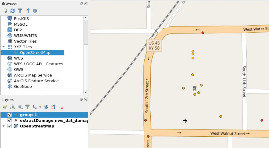 Now we can zoom in on the location where these new Taggit symbols appeared (see below). The Taggit symbols are the layer shown here as “group-1.” On the map, the red points are from the NWS database, and the yellow points are from the Taggit data.