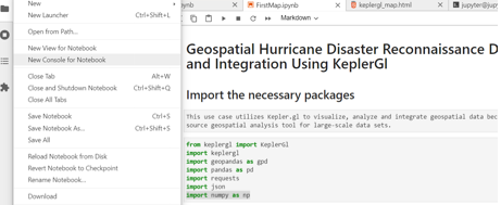 The purpose of this JupyterLab is to integrate field damage, hazard, and exposure data from past hurricane events. KeplerGl provides customizable geospatial map visualization and user-friendly analysis tools. Different kinds of data from different sources related to any hurricane event are collected. The exposure data from the National Structure Inventory (NSI) database and flood data from U.S. Geological Survey (USGS) are both collected via an application-programming interface or API. API is storage-friendly and updates automatically. In that case, the script connects to the service provider. The field damage reconnaissance data from Structural Extreme Events Reconnaissance (StEER) is available from both DesignSafe and Fulcrum without an API, whereas the wind field data from the Applied Research Associates, Inc. (ARA) wind grid is on DesignSafe.