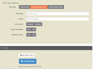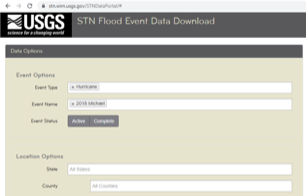 REST is a common API that that uses HTTP requests to access and use data. To get the REST URLs for a hazard event where flood was present, visit https://stn.wim.usgs.gov/STNDataPortal/#, browse the flood event (in this use case it is 2018 Michael) and hit the 'Get REST URL' button at the bottom of the page (see figure 4).