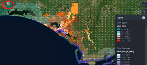 ARA wind grid data for hurricane events is available on DesignSafe for each event. The grid wind data includes two fields: The 1-minute sustained maximum wind speed (mph) and the 3-second maximum wind gust (mph), both at 10-meters for open terrain. Both can be displayed as separate layers on the map.