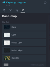 There are several extra tools in KeplerGl that allow the user to customize the map further. The first most important capability of KeplerGl is that the map style can be changed by clicking on the Base map icon (see Figure6).
