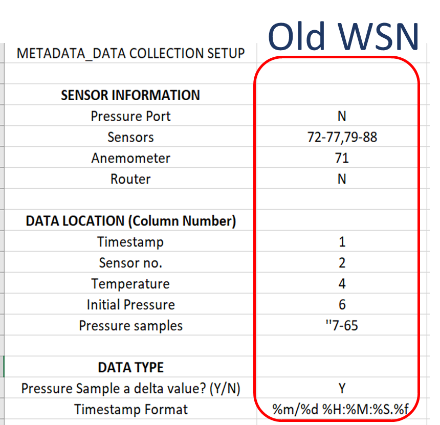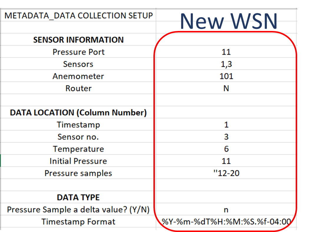 The first notebook is a user interactive guide to input important raw data information. This notebook saves time as the user does not have to read, understand and edit the code to change information regarding sensors, columns and data formats. For example, WSNS deployment during the tropical storm Isaias (8/2/2020) used an old and a new WSNS system. The first notebook documented the significant differences in data storage between the two systems. This accelerates data processing as there is no change required in code and the file generated by the notebook acts as a metadata for the second notebook responsible for data processing. Figure 4 below shows snapshots of the output file created by the first notebook describing raw data information from two different systems.