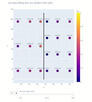 The project objective is to study high impact wind events on non-structural components of residential houses. After the deployment or the test, Jupyter notebooks process and visualize important data for different purposes, including among others: comparisons to ASCE 7 standard; and assessment of sensor performance with respect to wind conditions. Plotly can create animation frames to look at a snapshot of data from all sensors in different test conditions or even at different timestamps. A single line of code enabled with the right data frame can quickly reveal trends in the data and facilitate troubleshooting of any system errors. Figure 7 below shows an application of plotly for one of the Wall of Wind tests for glass sliding doors. The test model was a mock-up box with flat roof, and full-scale glass sliding doors, which were tested at 105 mph for different wind directions. At uniform velocity, data for each wind direction was collected for 3 minutes and the program computed pressure coefficient Cp values averaged over that time window. A 2D scanner plot was created with x and z dimensions with each point representing a sensor whose colour corresponded to a Cp value on the colour scale. A single line of code enables the animation frame, which reveals important information: