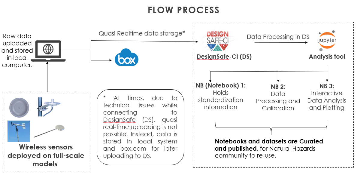 Florida Tech (FIT) teams deploy networks of wireless sensors on residential houses during high impact wind events or on full scale wind tunnel models. Each deployment might include pressure, temperature and humidity sensors alongside different anemometers and a conical scanning infrared LIDAR. Figure 1 describes the workflow, which starts with uploading the data to DesignSafe through authentication tokens created in Tapis. Once on DesignSafe, three Jupyter notebooks process and visualize the instruments data for analyses. The notebooks provide a user friendly and interactive environment that can adapt to different datasets. For this project, the notebooks perform quasi static real-time analysis, assess sensor performance, and study pressure variations for different wind conditions and data correlation. The user interactivity of these notebooks facilitates an easy adaptation to different datasets with little to no-change in code.