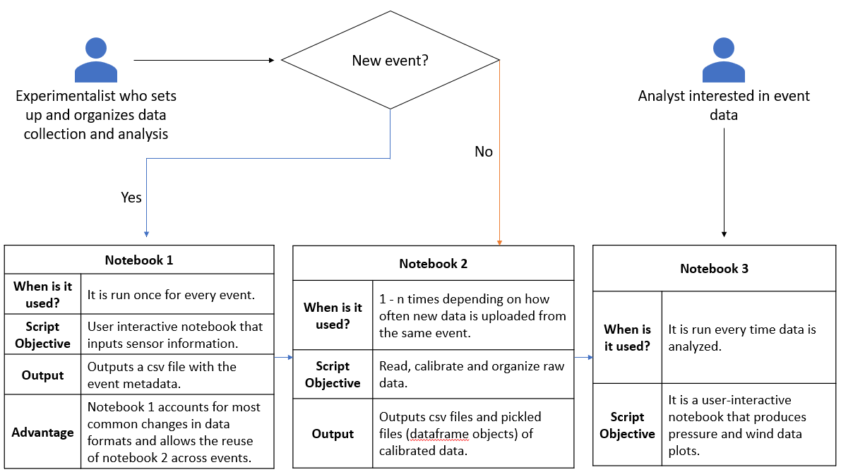To save time and memory, the project uses three different notebooks. For any event, either a field deployment or a wind tunnel experiment, the first notebook inputs metadata (sensor information, data columns, timestamp formats) for the dataset and is ideally used once for every event. It outputs a csv file containing the metadata required to run the second notebook. The second notebook calibrates raw data and organizes them into csv and pickled files. This notebook may be run more than once depending on how often new data is uploaded during the event. With the third notebook, users analyse and visualize the data interactively. This is the most frequently used notebook and is run every time the data needs to be analysed. There is no need to execute the notebooks sequentially every time an analysis is done. Figure 3 below illustrates the possible sequences of analysis:
