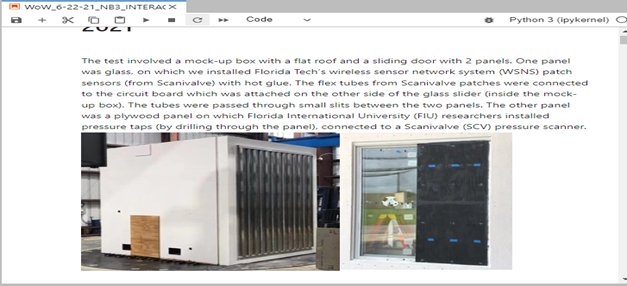 The project goal is to measure pressure variation on non-structural components during either strong wind events or full-scale testing in the WoW, using the network of wireless sensors. The analysis notebooks on DesignSafe are user interactive with markdowns describing the test. They also provide the users with several options to visualize the data. For example, figure 5a shows the analysis notebook for Isaias (tropical storm on August 1-3, 2020) while Figure 5b shows the analysis notebook for WoW test. The markdowns have important information and pictures from the deployment, and instructions for the user to easily access data.
